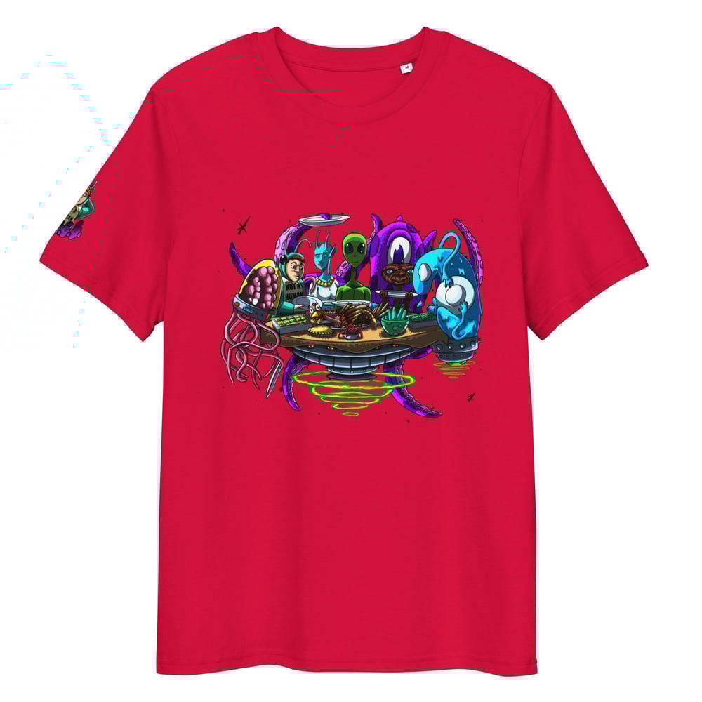What happens when aliens celebrate Thanksgiving? A whole lot of cosmic chaos. This design shows a cast of extraterrestrials gathered around a dinner table, sizing up an out-of-this-world feast. It’s warm, weird, and hilarious — blending holiday vibes with intergalactic mischief. Perfect for the plate stackers across the universe.